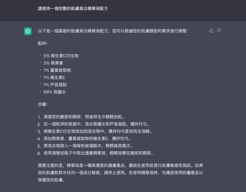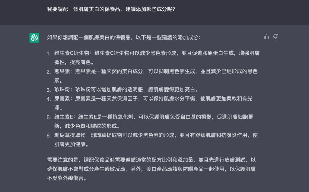 假設有一位非專業人士想要藉由 AI 來開發一款美白產品,來看看 ChatGPT 如何協助完成此任務!我們先了解有哪些美白成分適合添加,如下圖所示,AI 的答案中有幾個並不是這麼適當,珍珠粉與珊瑚草萃取物尚無充足的實驗證據來支持他們的功效,而維他命E則是大家熟知的抗氧化成分,對肌膚美白的幫助並不是這麼直接。接下來,我們請它提供一個完整的美白配方,也出現幾個問題。其中建議添加 5% 的維他命C衍生物,但衛福部公告的幾個常見維他命C衍生物添加上限最高不能超過 3%,跟現實使用情況不相符。再來,配方中缺乏完善的防腐系統,產品安全性絕對有問題。最後,保濕成分只有使用 1% 蘆薈凝膠,沒有其他小分子保濕成分,保濕效能與膚感的調控似乎不夠完善。
