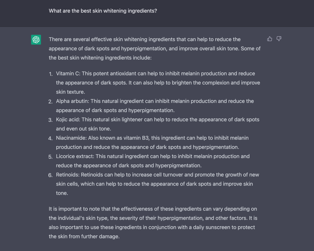 聰明的我們想到,這個系統是美國人開發的,或許英文網路世界中會有更多更正確的資訊,讓我們用英文來發問試試看。果然,推薦的美白成分較為合理,它們都有較充足的科學文獻支持。但是在配方建議上,仍然有相同的問題存在。除此之外,1% Niacinamide 的添加建議也不是這麼適當,因為文獻中使用的是 4% 的添加劑量才觀察到肌膚美白的功效。