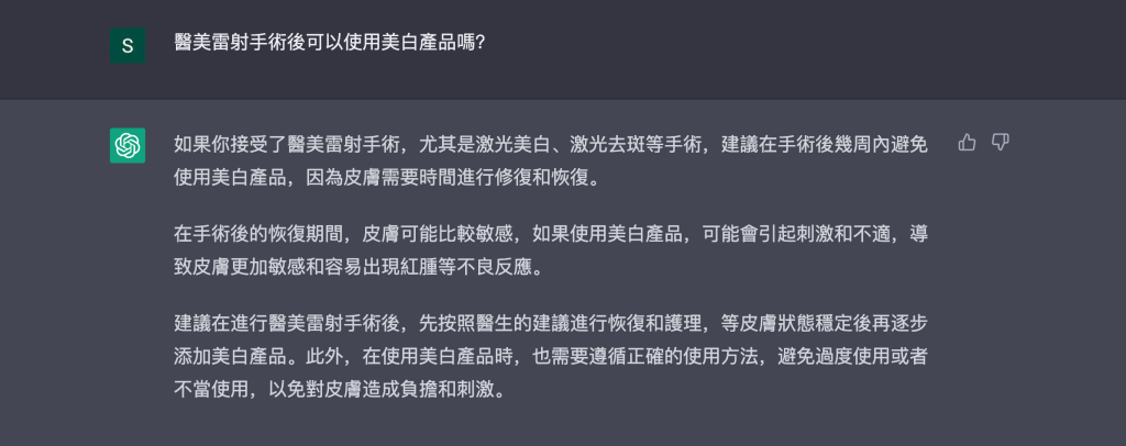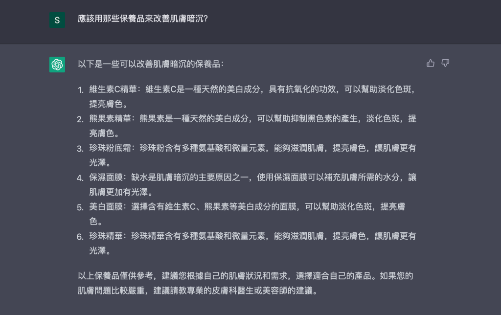 客服一直是常常被提到可以用機器人或者人工智慧取代的行業,一些不複雜且重複性高的問題確實可藉由這樣的方式處理,例如訂單查詢、出貨問題、優惠資訊等。但保養諮詢還是有許多專業的部分需要考量,在上一局中,AI 已經敗陣下來,在這一局是否能反敗為勝呢?如下圖問答所示,我們向它提出了常被問到的問題,很明顯的 AI 的回覆並不正確。因為肌膚暗沉可以分成三種(詳細可參考美白淡斑精華這樣擦才有效!1 次掌握基本觀念),其中兩種可以藉由保養品有效改善,但 AI 的回答只考慮到了因黑色素造成的暗沈處置,而忽略了老舊角質應該要加強代謝的可能性。這是多數人不清楚的部分,必須藉由專業客服來引導,了解暗沉成因後才能給予合適的建議。第二個問題我們詢問了醫美後是否能使用美白產品,這個在我們過往的研究識文章也有說明,其實只要美白產品不含像是煥膚酸有加速角質代謝的成分,一般都是可以正常使用的!一般群眾通常不了解問題所在,需要藉由客服人員的抽絲剝繭,一步步的詢問後才能釐清狀況,所以這一局依舊是人類獲勝,AI 缺乏邏輯性的問答引導是成為專業客服的致命傷。