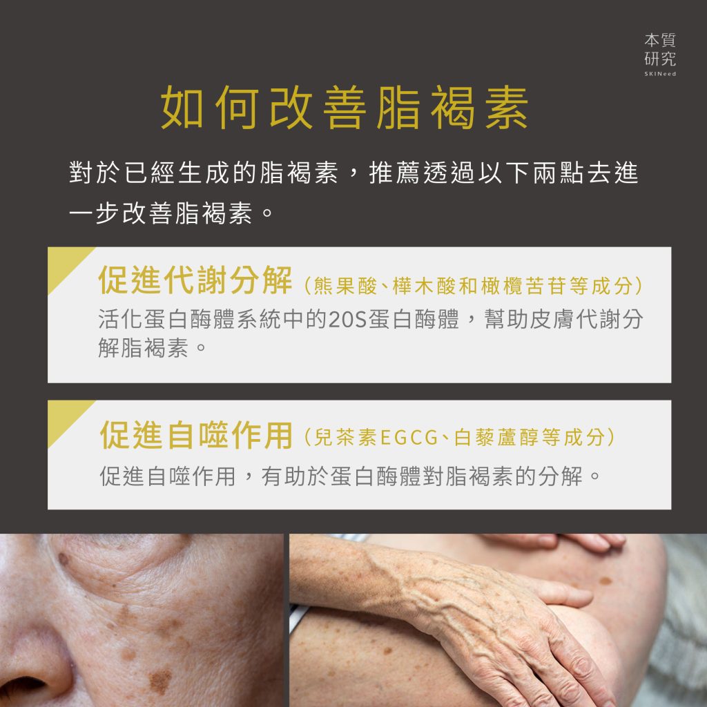 對於已經生成的脂褐素,推薦透過以下兩點去進一步改善,可以觀察手邊有沒有添加這些成分的產品來幫助改善脂褐素